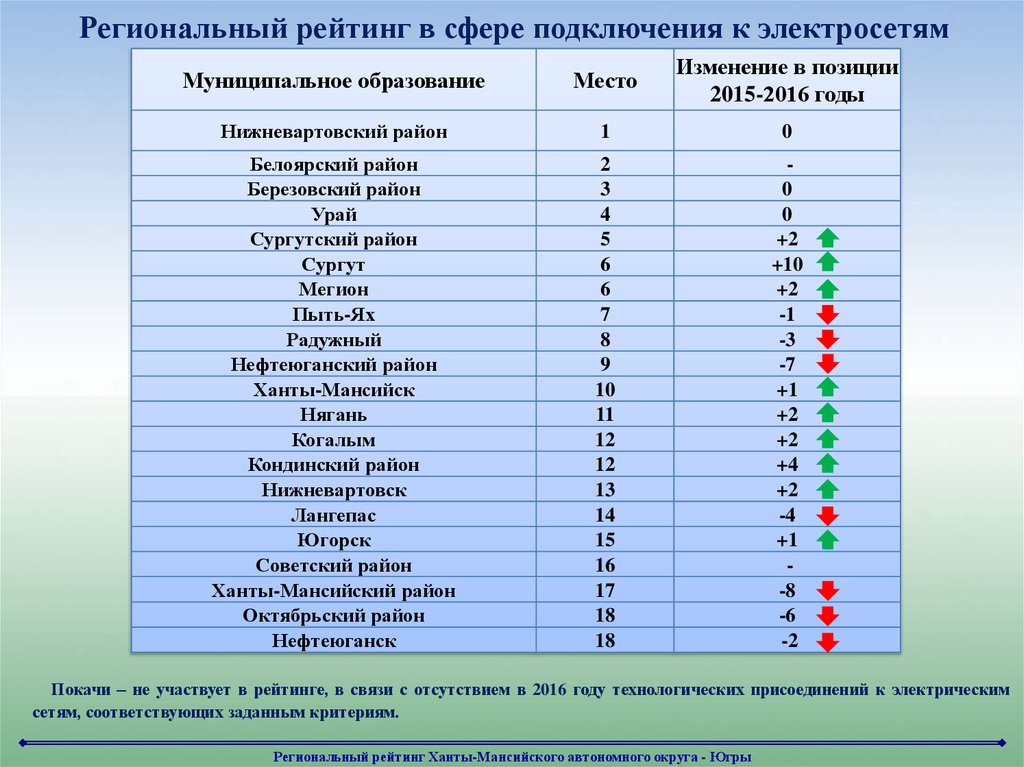 Покачи – не участвует в рейтинге, в связи с отсутствием в 2016 году технологических присоединений к электрическим
