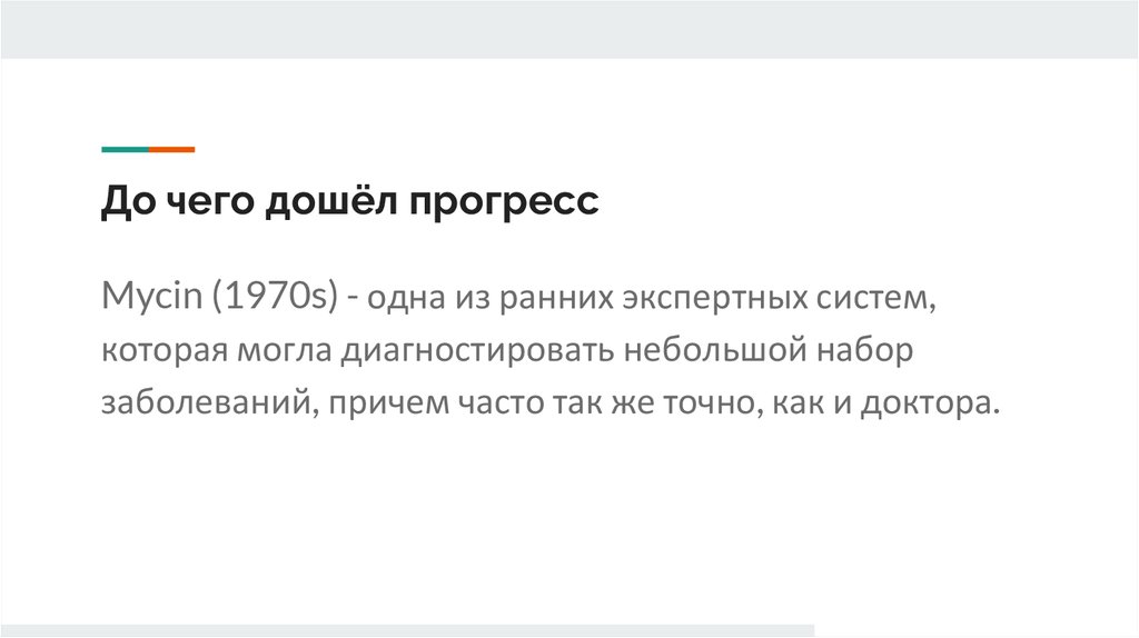 До чего дошёл прогрессMycin (1970s) - одна из ранних экспертных систем,