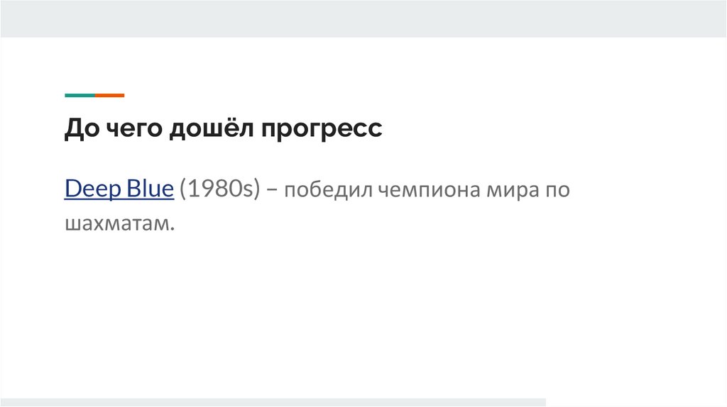 До чего дошёл прогрессDeep Blue (1980s) – победил чемпиона мира по