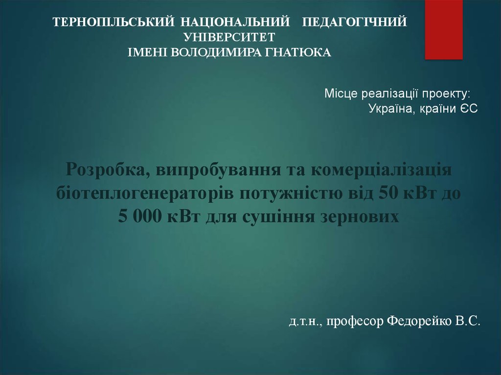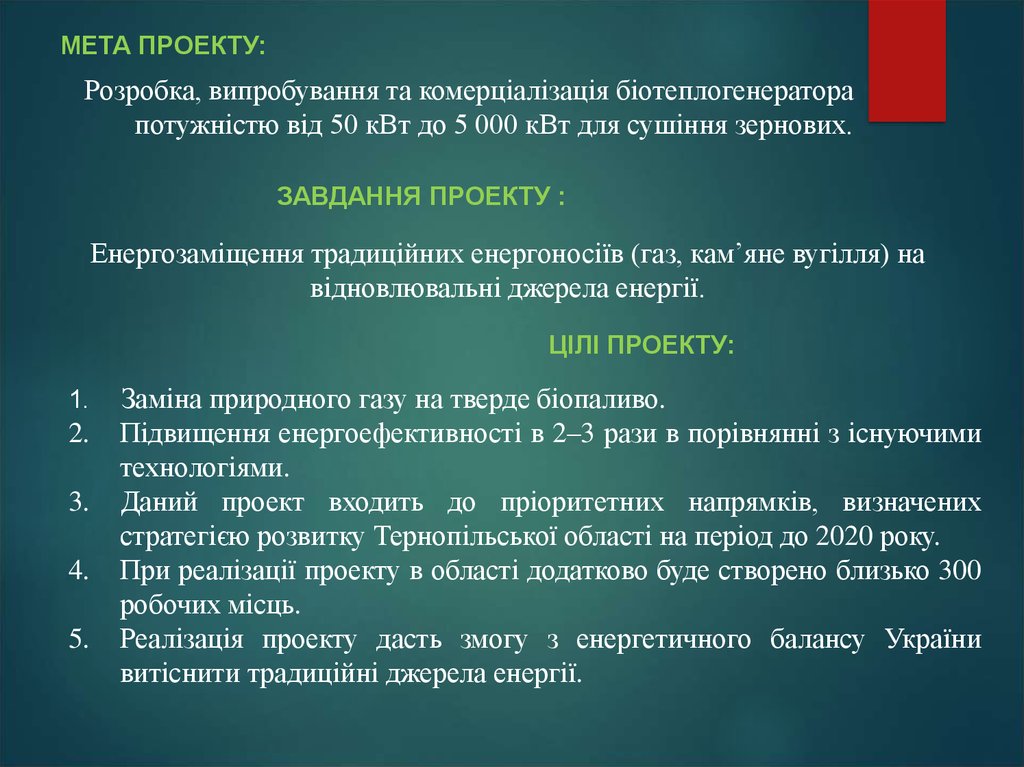 МЕТА ПРОЕКТУ:Розробка, випробування та комерціалізація біотеплогенератора