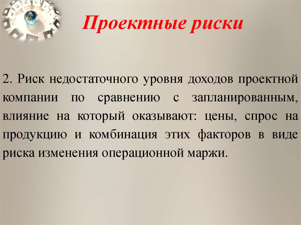 Проектные риски2. Риск недостаточного уровня доходов проектной
