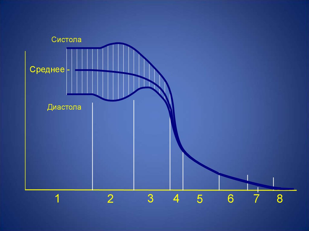 Распределение величин давления,скорости и объема крови в сосудах человека