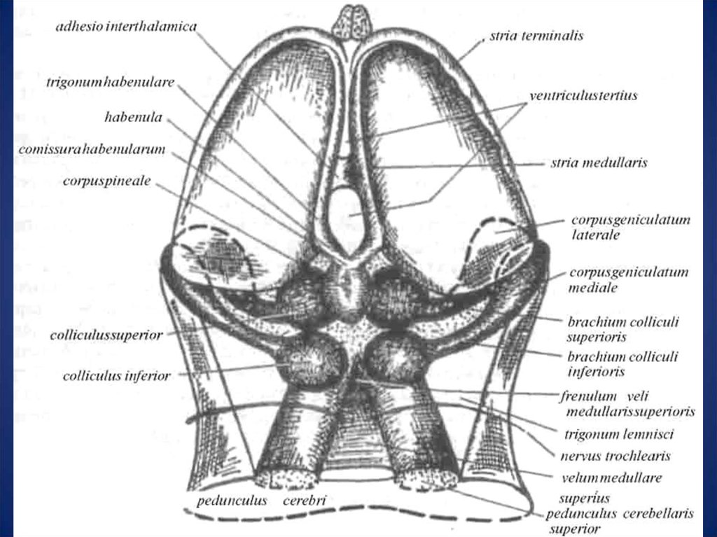 1 — промежуточный мозг; 2 — мамиллярные тела; 3 — перекрест зрительных