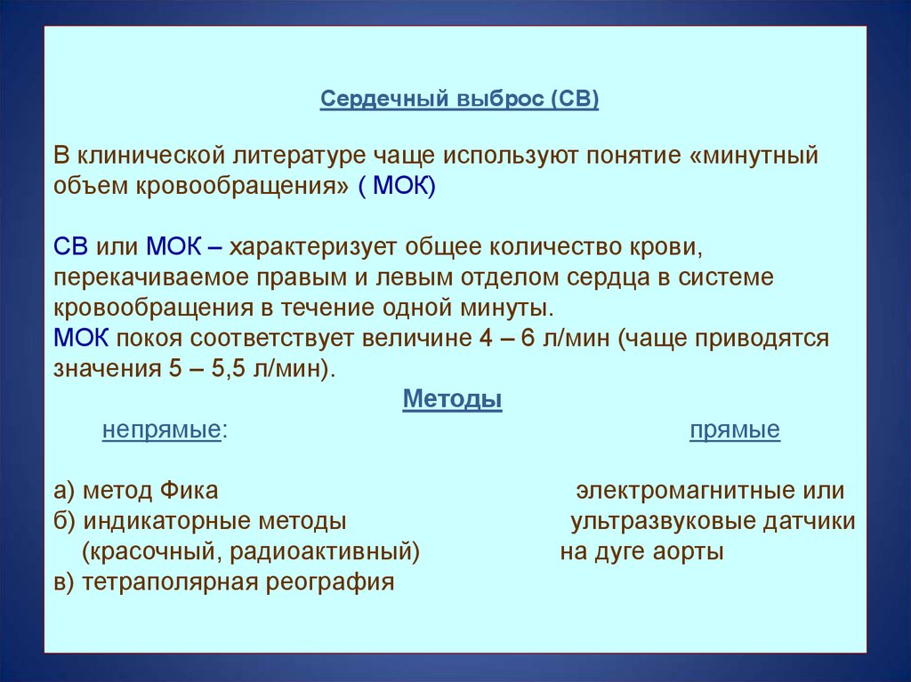 МОК покоя соответствует величине 4 – 6 л/мин (чаще приводятся