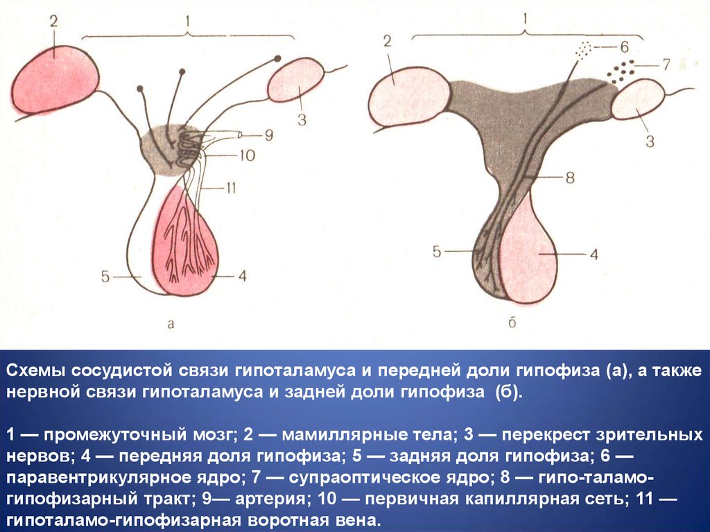 Схемы сосудистой связи гипоталамуса и передней доли гипофиза (а), а такженервной связи гипоталамуса и задней доли гипофиза (б).
