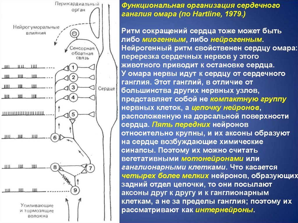 Функциональная организация сердечногоганглия омара (по Hartline, 1979.)