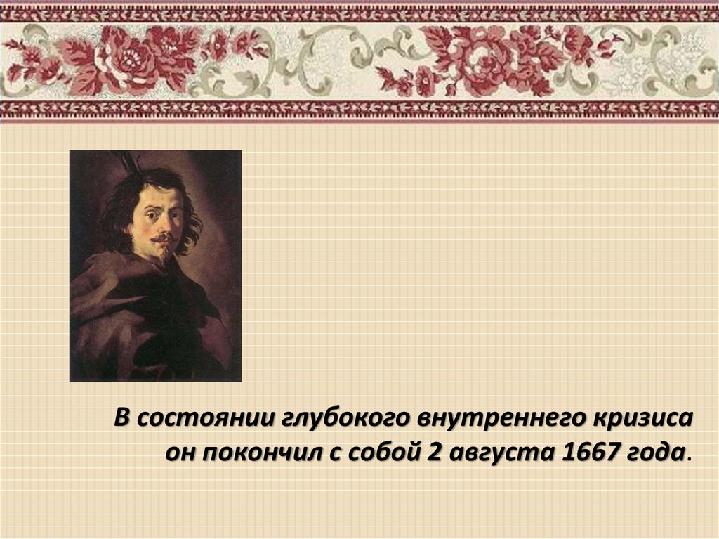 В состоянии глубокого внутреннего кризисаон покончил с собой 2 августа 1667 года.