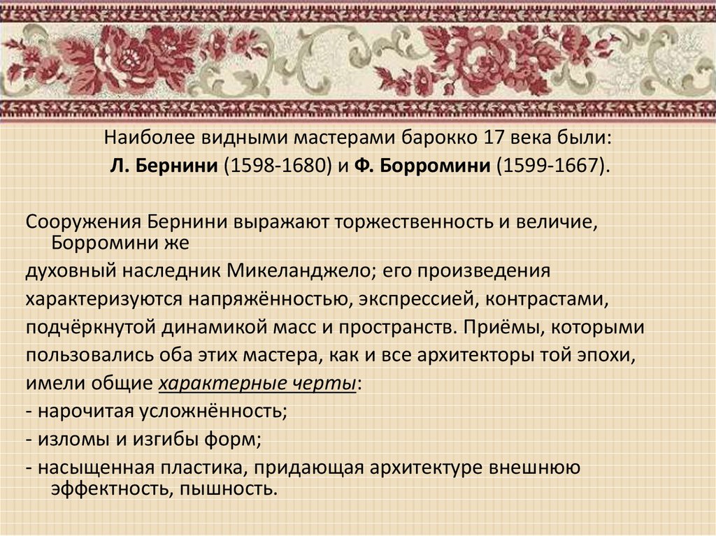 Наиболее видными мастерами барокко 17 века были:Л. Бернини (1598-1680) и Ф. Борромини (1599-1667).