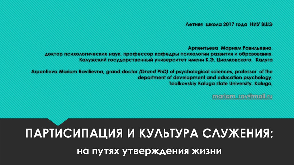 1. Летняя школа 2017 года НИУ ВШЭ Арпентьева Мариям Равильевна, доктор психологических наук, профессор кафедры психологии развития