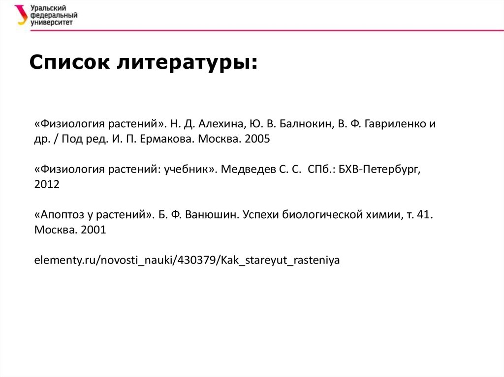 Список литературы:«Физиология растений». Н. Д. Алехина, Ю. В. Балнокин, В. Ф. Гавриленко и