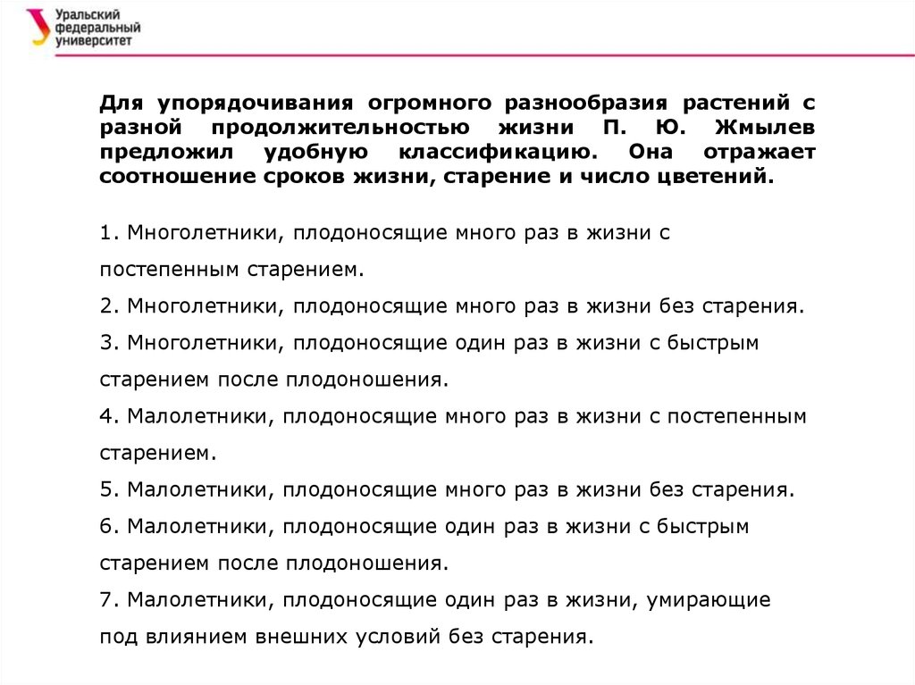 Для упорядочивания огромного разнообразия растений сразной продолжительностью жизни П. Ю. Жмылев