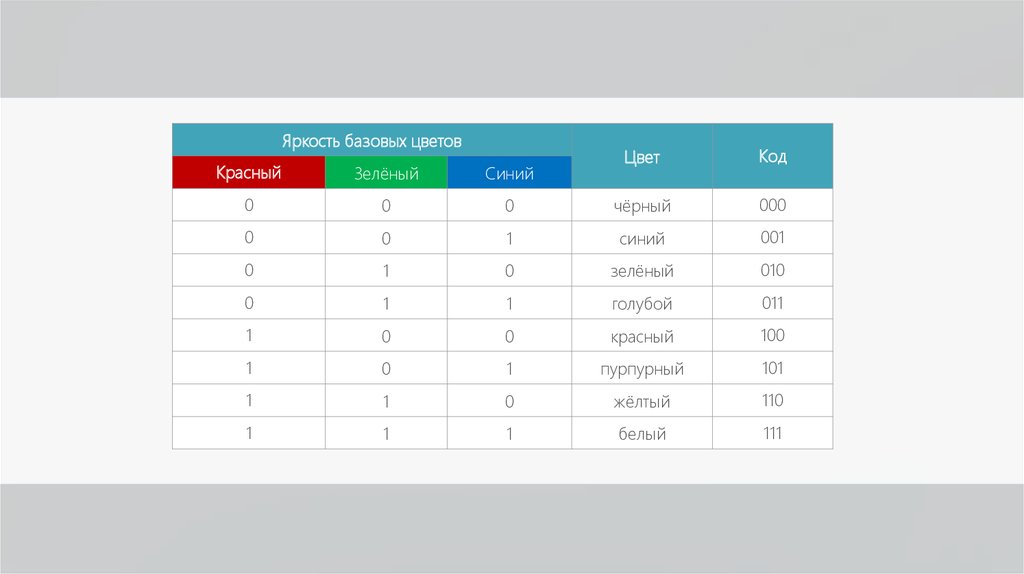 Белый цвет = красный + синий + зелёныйЧёрный цвет = отсутствие красного, синего и зелёного