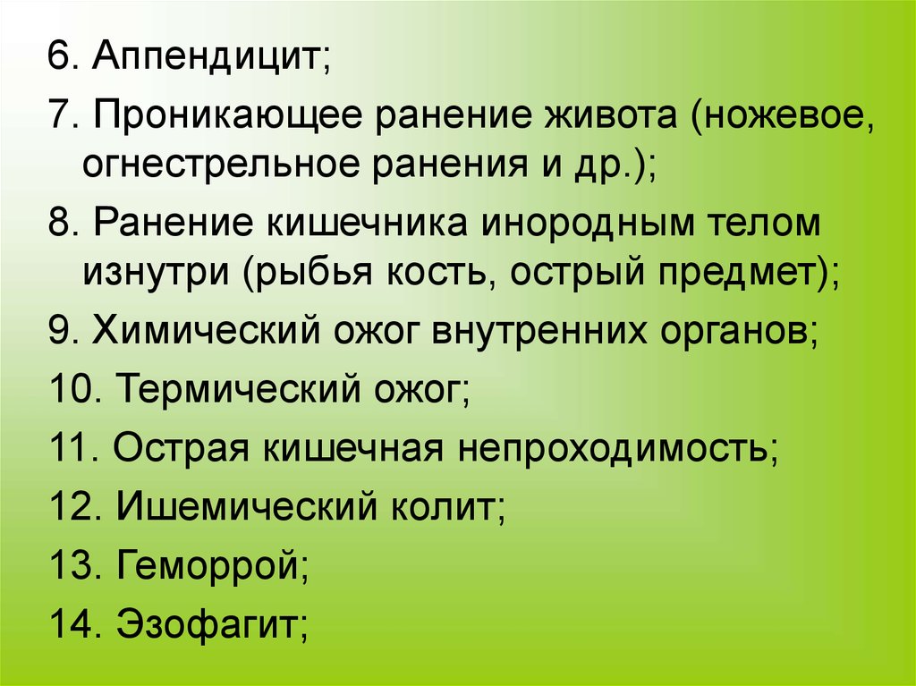 6. Аппендицит;7. Проникающее ранение живота (ножевое,