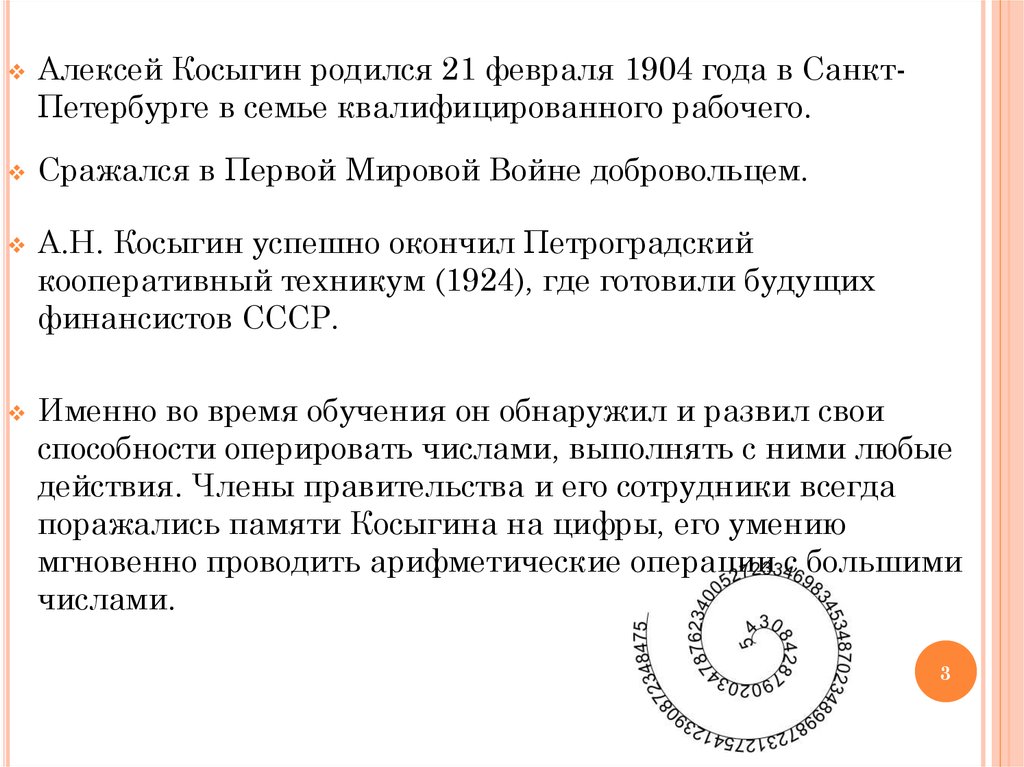 Алексей Косыгин родился 21 февраля 1904 года в СанктПетербурге в семье квалифицированного рабочего.Сражался в Первой Мировой Войне добровольцем.
