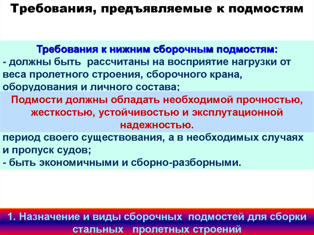 Требования, предъявляемые к подмостямТребования к нижним сборочным подмостям: