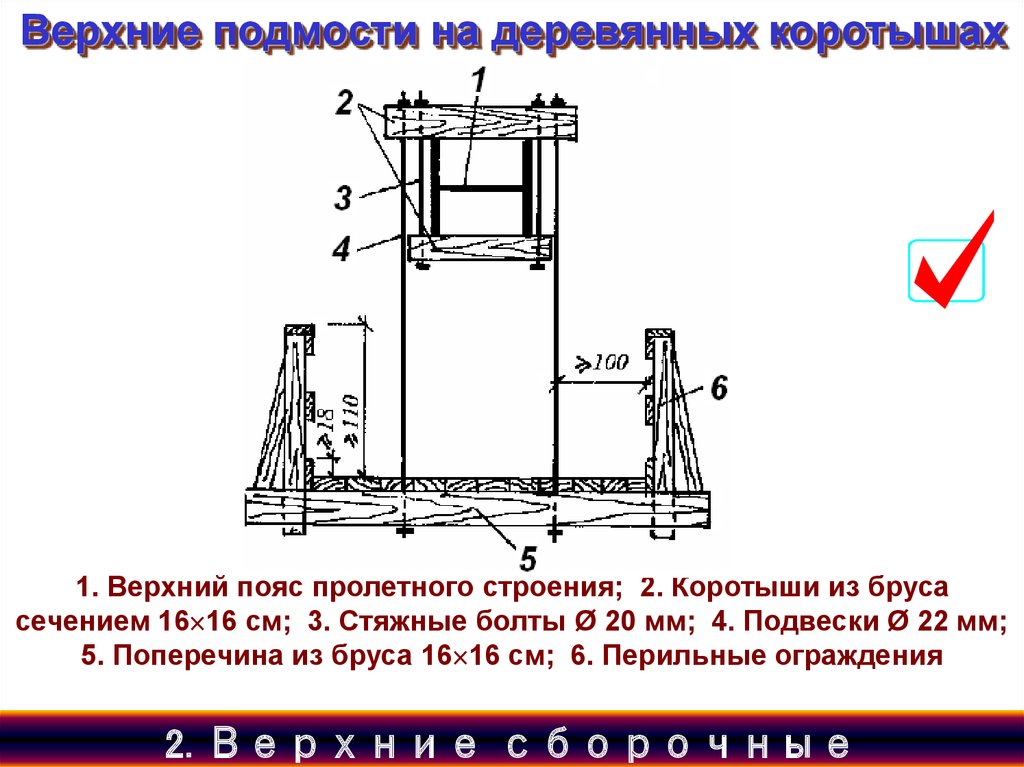 Верхние подмости на деревянных коротышах1. Верхний пояс пролетного строения; 2. Коротыши из бруса
