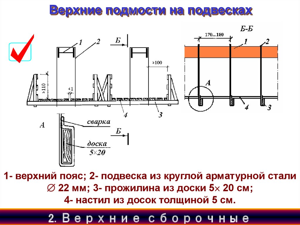 Верхние подмости на подвесках1- верхний пояс; 2- подвеска из круглой арматурной стали