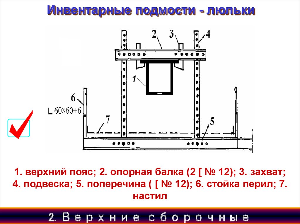 Инвентарные подмости - люльки1. верхний пояс; 2. опорная балка (2 [ № 12); 3. захват;