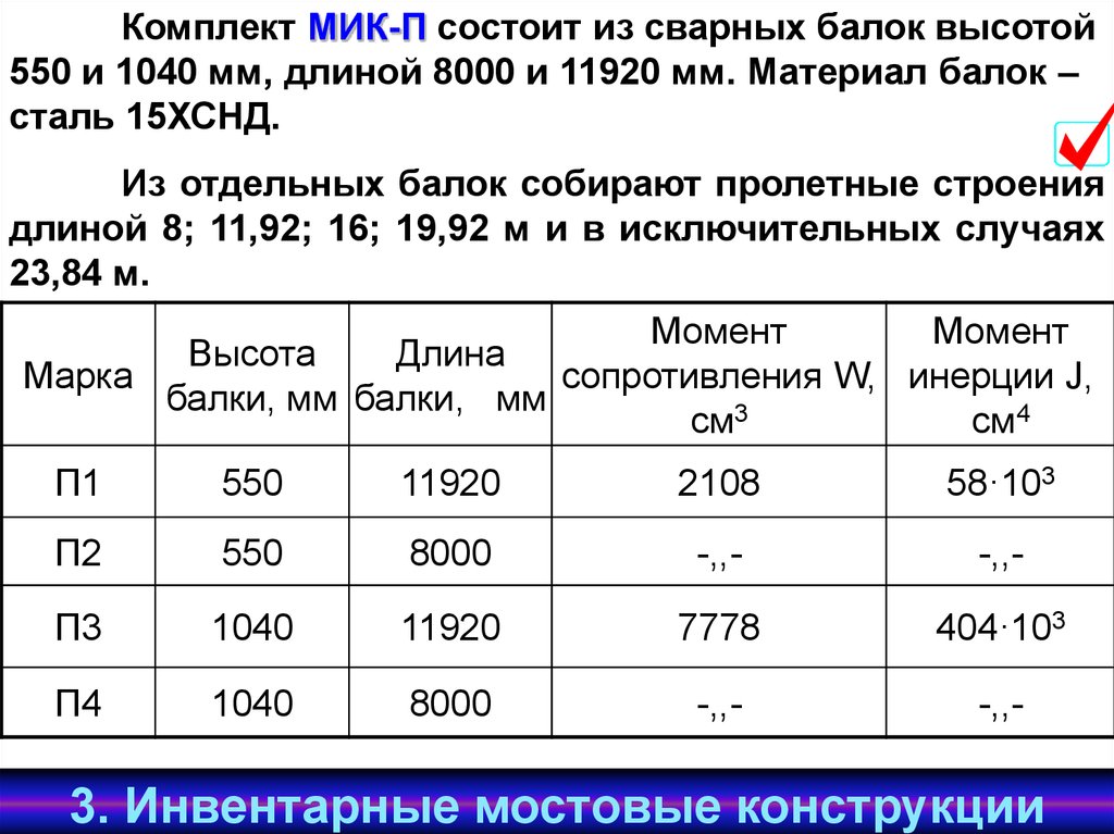 Комплект МИК-П состоит из сварных балок высотой550 и 1040 мм, длиной 8000 и 11920 мм. Материал балок –