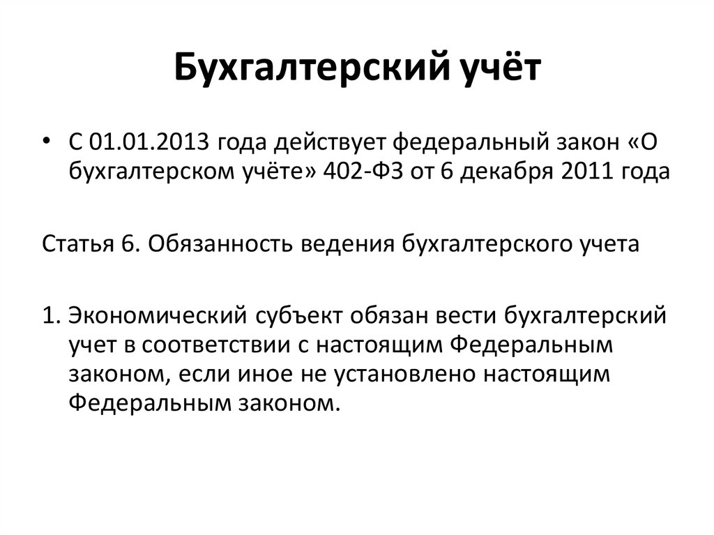Бухгалтерский учёт• С 01.01.2013 года действует федеральный закон «О
