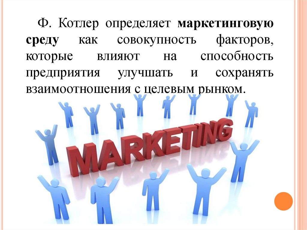 Ф. Котлер определяет маркетинговуюсреду как совокупность факторов,