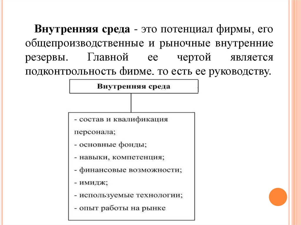Внутренняя среда - это потенциал фирмы, егообщепроизводственные и рыночные внутренние