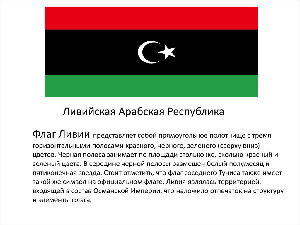 Ливийская Арабская РеспубликаФлаг Ливии представляет собой прямоугольное полотнище с тремя