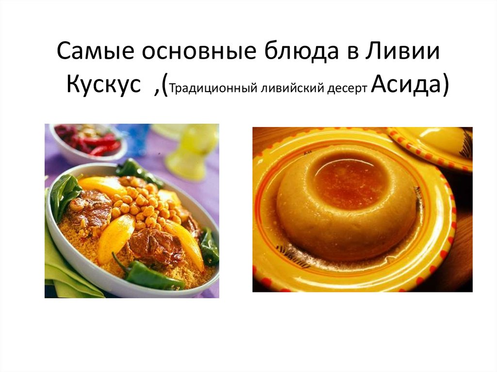 Самые основные блюда в ЛивииКускус ,(Традиционный ливийский десерт Асида)
