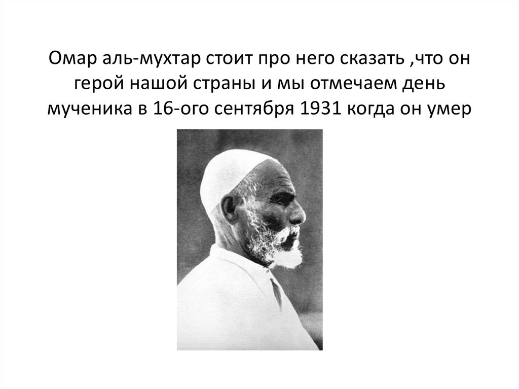 Омар аль-мухтар стоит про него сказать ,что онгерой нашой страны и мы отмечаем день