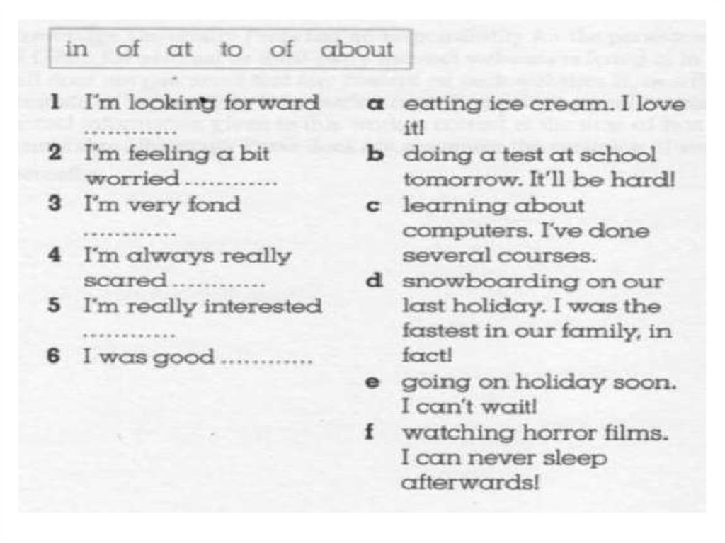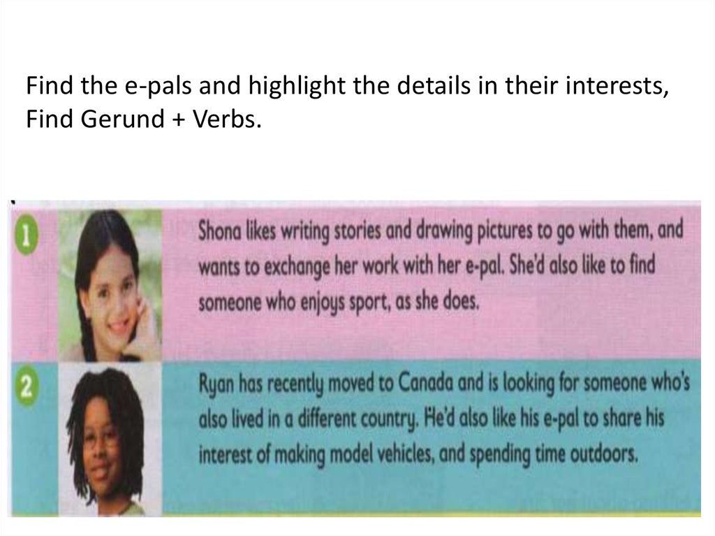 Find the e-pals and highlight the details in their interests,Find Gerund + Verbs.
