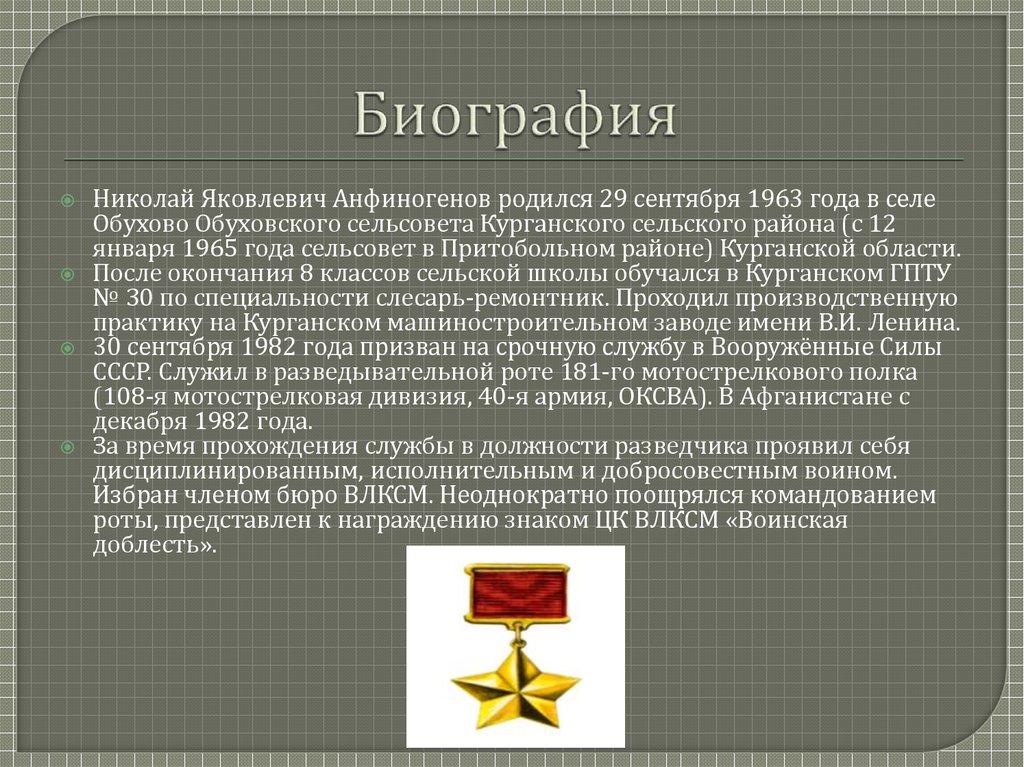 Николай Яковлевич Анфиногенов родился 29 сентября 1963 года в селеОбухово Обуховского сельсовета Курганского сельского района (с 12