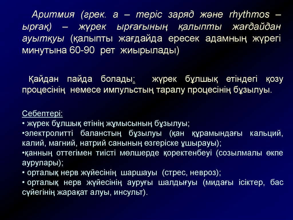 Аритмия (грек. а – теріс заряд және rhythmos –ырғақ) – жүрек ырғағының қалыпты жағдайдан