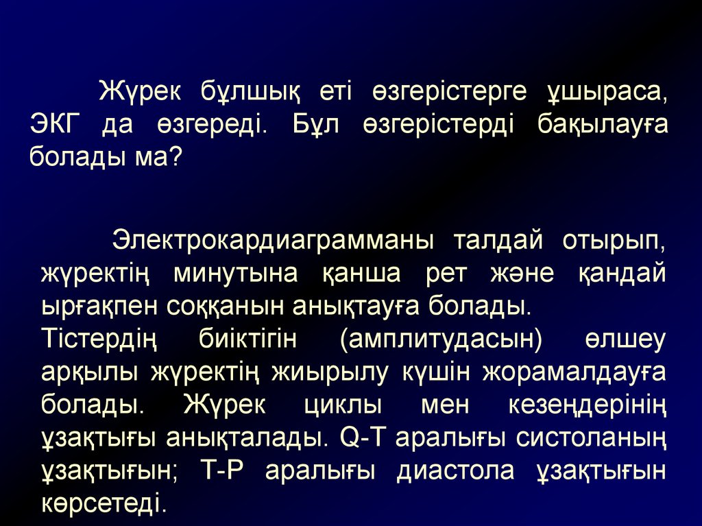 Жүрек бұлшық еті өзгерістерге ұшыраса,ЭКГ да өзгереді. Бұл өзгерістерді бақылауға