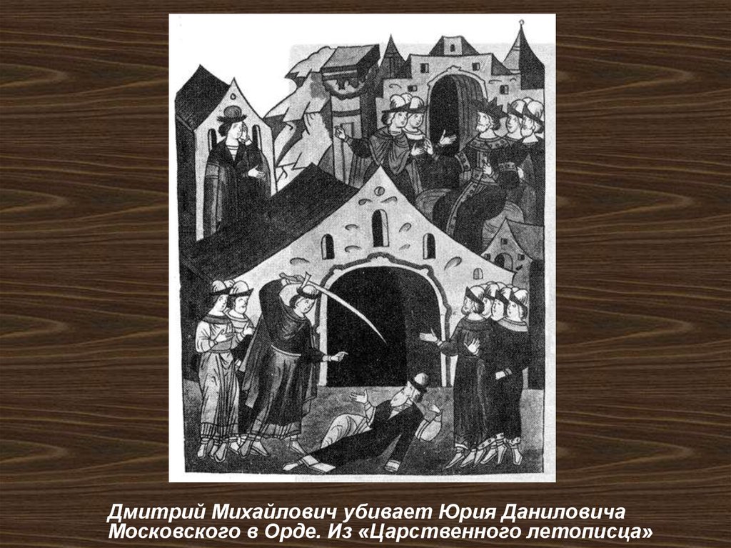 Дмитрий Михайлович убивает Юрия ДаниловичаМосковского в Орде. Из «Царственного летописца»