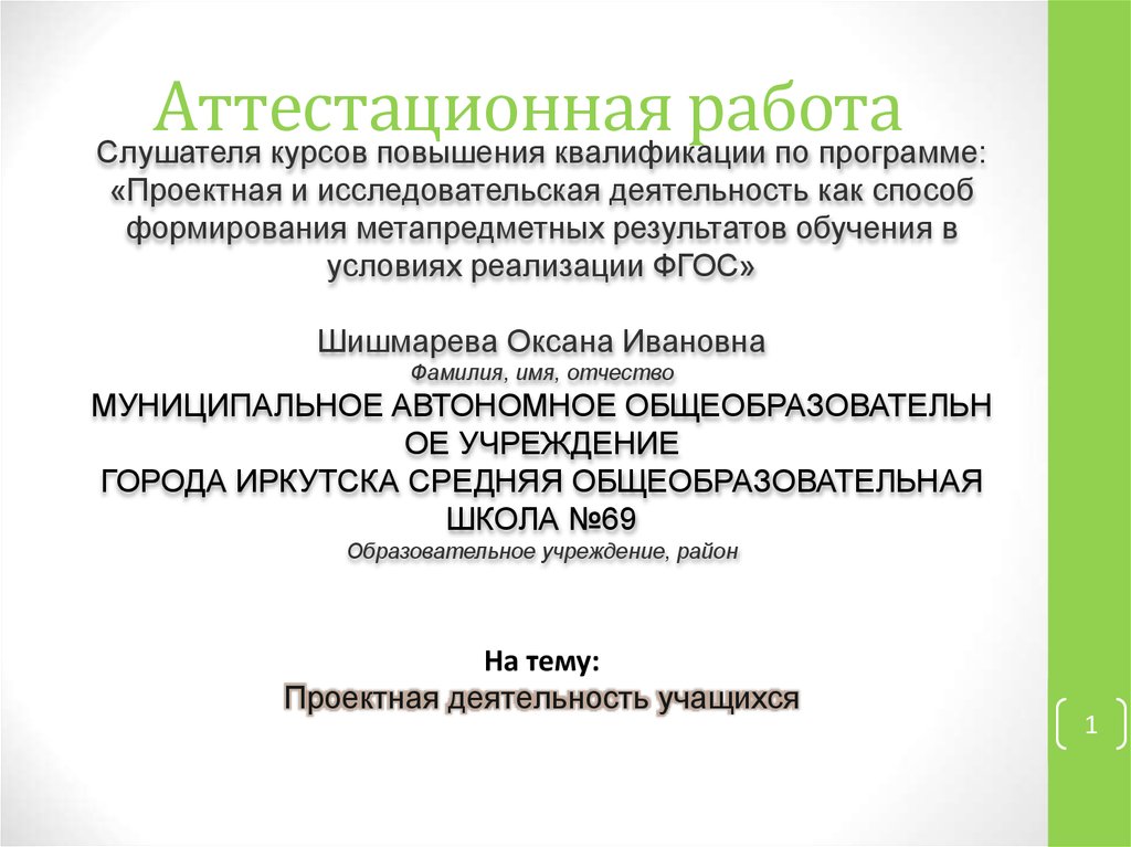 Слушателя курсов повышения квалификации по программе:«Проектная и исследовательская деятельность как способ