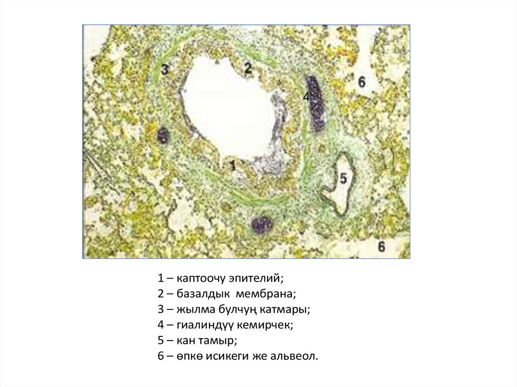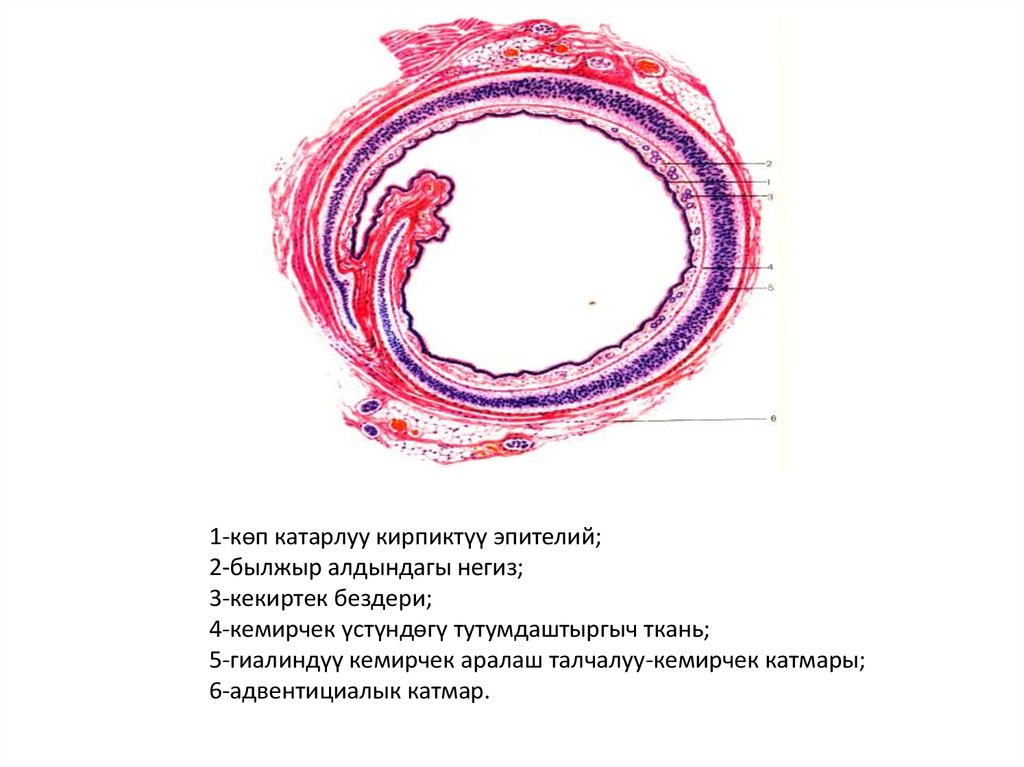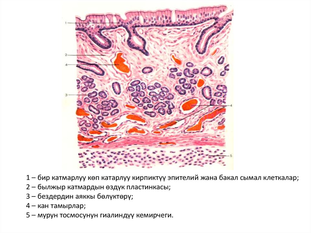1-көп катарлуу кирпиктүү эпителий;2-былжыр алдындагы негиз;