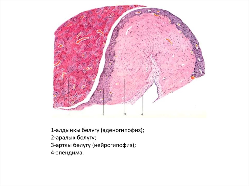 1-алдыңкы бөлүгү (аденогипофиз);2-аралык бөлүгү;