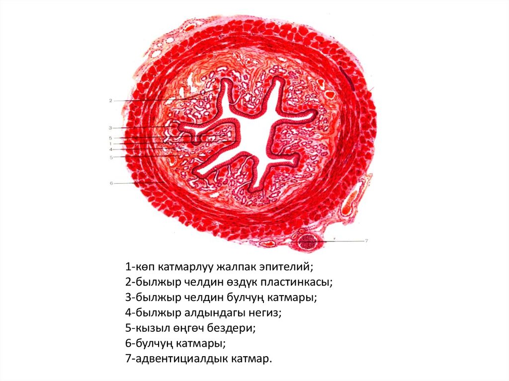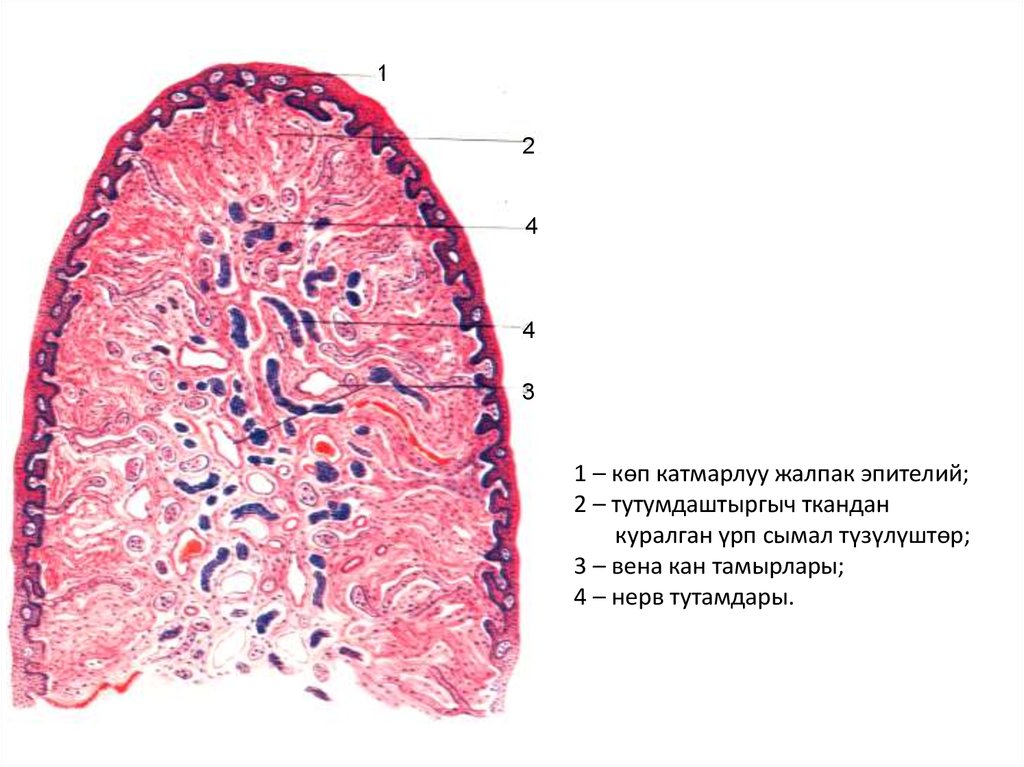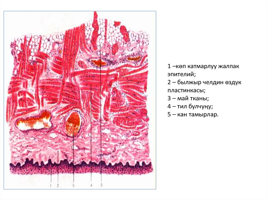 1-көп катмарлуу жалпак эпителий;2-былжыр челдин өздүк пластинкасы;