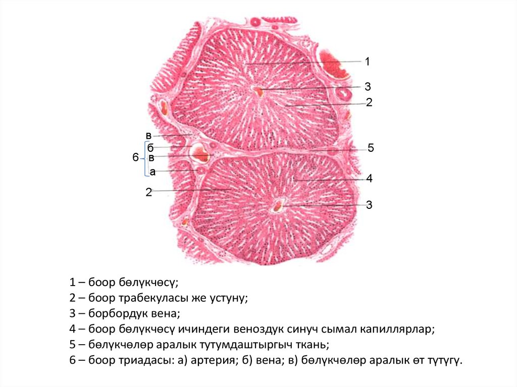6 – боор триадасы: а) артерия; б) вена; в) бөлүкчөлөр аралык өт түтүгү.
