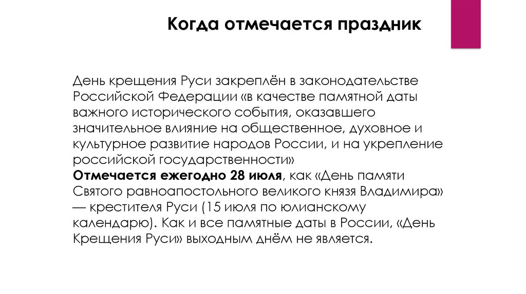Когда отмечается праздникДень крещения Руси закреплён в законодательстве
