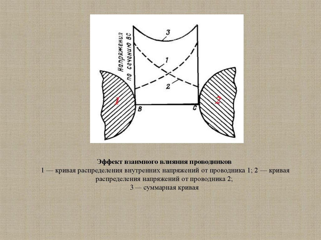 Эффект взаимного влияния проводников1 — кривая распределения внутренних напряжений от проводника 1; 2 — кривая
