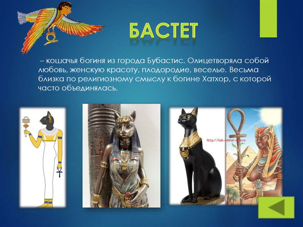 – кошачья богиня из города Бубастис. Олицетворяла собойлюбовь, женскую красоту, плодородие, веселье. Весьма