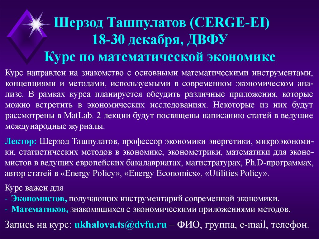 Лектор: Шерзод Ташпулатов, профессор экономики энергетики, микроэкономики, статистических методов в экономике, эконометрики, математики для экономистов в ведущих европейских бакалавриатах, магистратурах, Ph.D-программах,