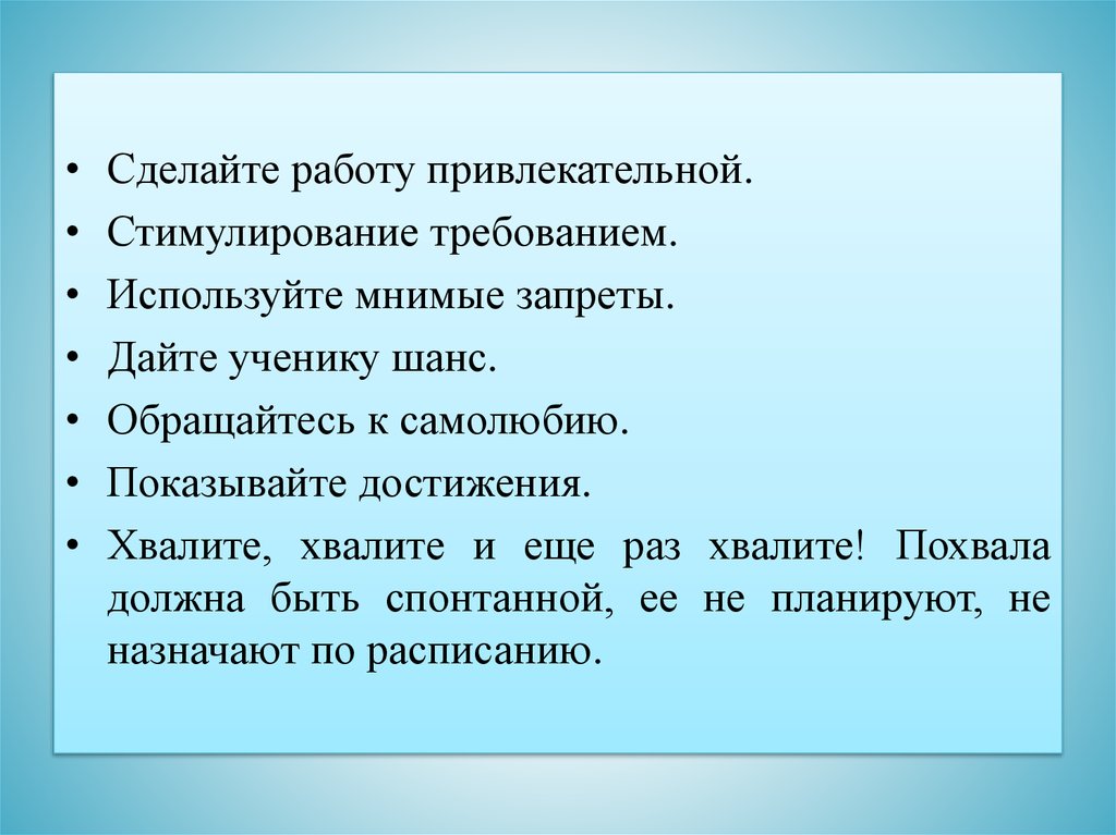 • Опирайтесь на желания. Чего хочет ученик – главный вопрос для учителя.Надо понять, что важно не только то, чего желаем мы, но и то, чего хочет