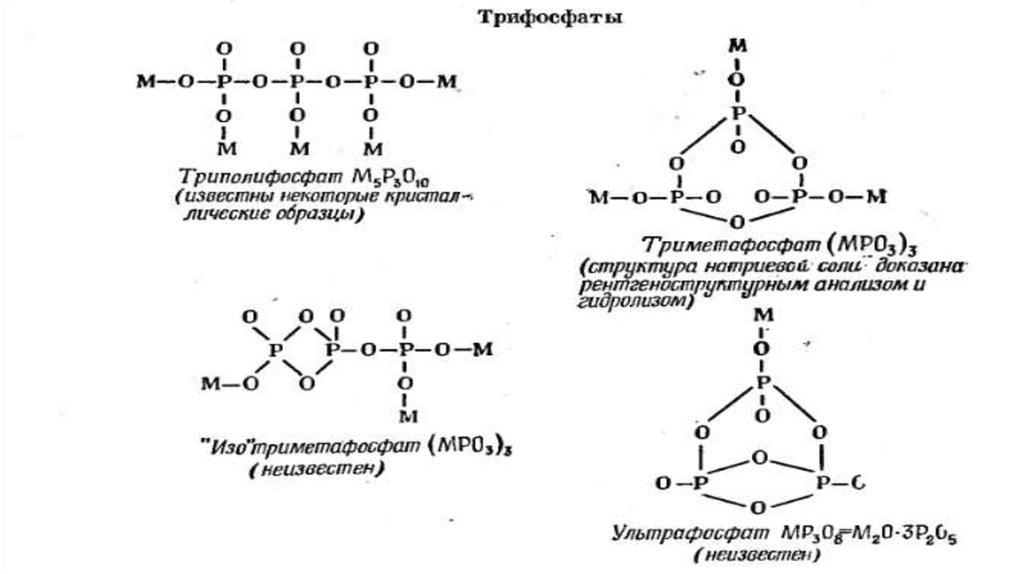 бар фосфаттар кездеспейді, бірақ 2 Р, 4 М атомды фосфаттың бар екендігі белгілі (R=M/P=