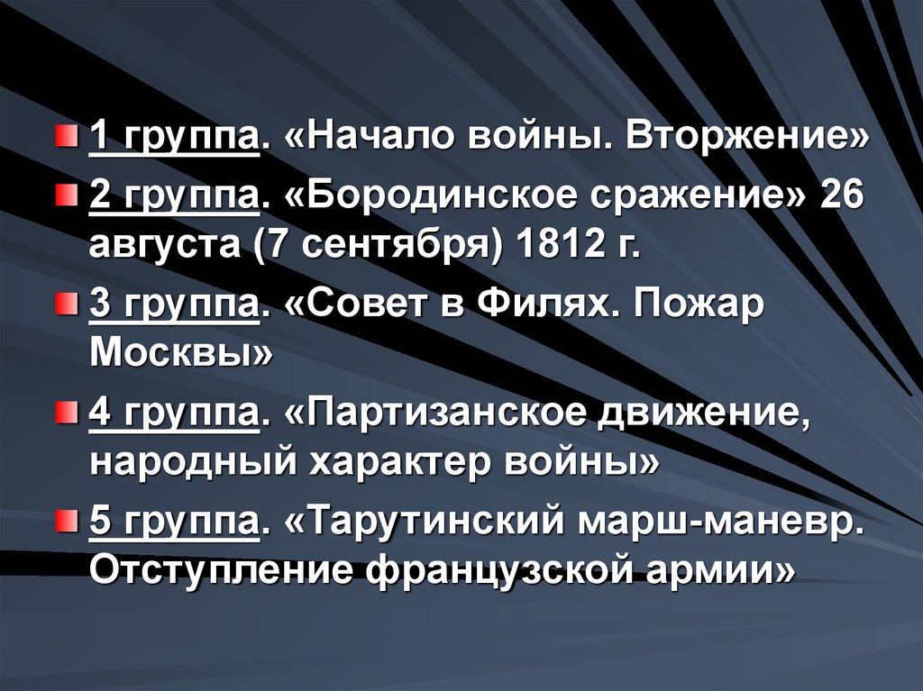 1 группа. «Начало войны. Вторжение»2 группа. «Бородинское сражение» 26