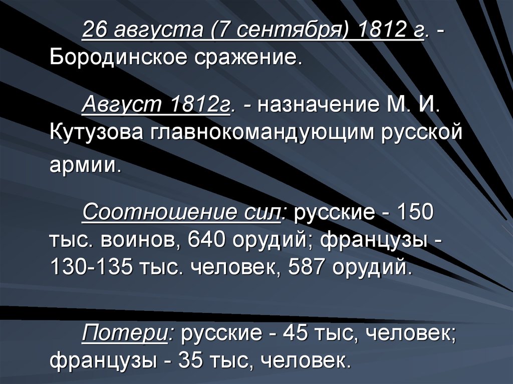 26 августа (7 сентября) 1812 г. Бородинское сражение.Август 1812г. - назначение М. И.
