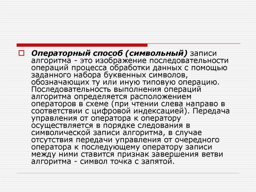 Операторный способ (символьный) записиалгоритма - это изображение последовательности