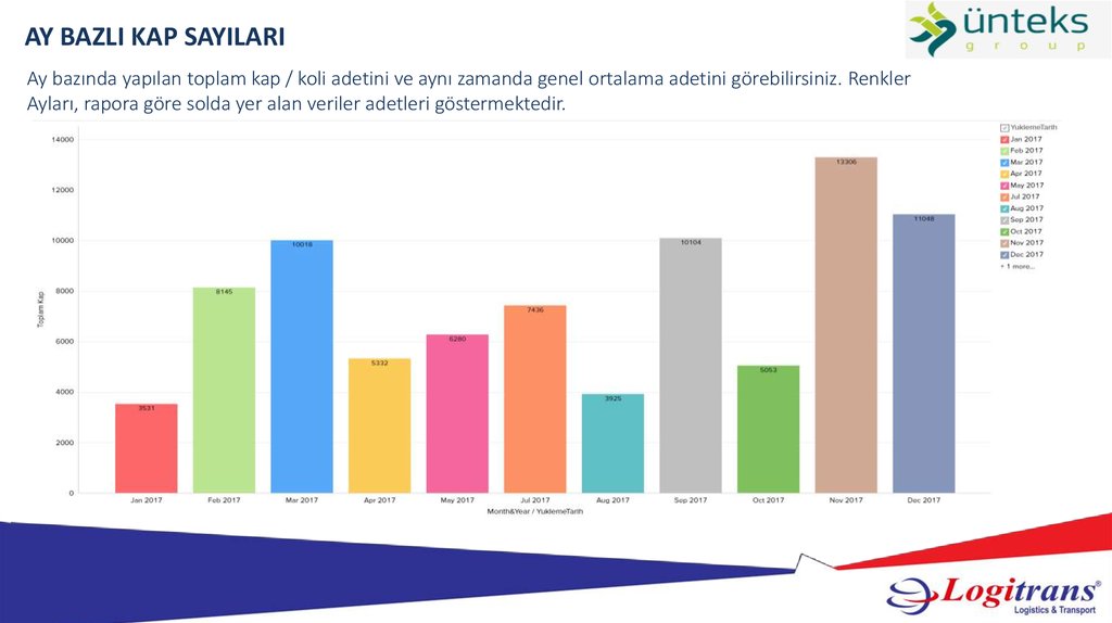 AY BAZLI KAP SAYILARIAy bazında yapılan toplam kap / koli adetini ve aynı zamanda genel ortalama adetini görebilirsiniz. Renkler