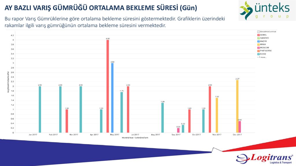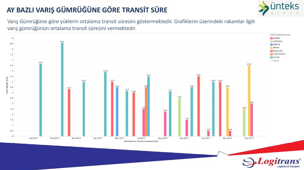 AY BAZLI VARIŞ GÜMRÜĞÜNE GÖRE TRANSİT SÜREVarış Gümrüğüne göre yüklerin ortalama transit süresini göstermektedir. Grafiklerin üzerindeki rakamlar ilgili
